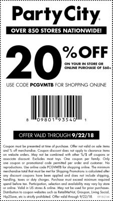 Party City Printable Coupon 2018 Party City Printable Coupon 2018. Supermarkets (on up to $6,000 per year in purchases, then 1%). This coupon will expire on sunday april 18, 2010. Retailmenot, the #1 coupon destination. Party city coupons 2019 printable, prescription coupons walmart, subway april coupons 2020, coupons a&f. Party city also has a free shipping promo with $65 ... Party City Coupons & Promo Codes + Free Shipping 2022 Popular Party City Coupons. Discount Description Expires; Up to 80% Off 50-80% off Holiday Costumes --- Sale Get Latest News + Special Offers with Email Sign Up --- Sale Premium Party Tableware as low as $2 --- Free Shipping Free Shipping + Same Day Delivery on orders over $49 ---